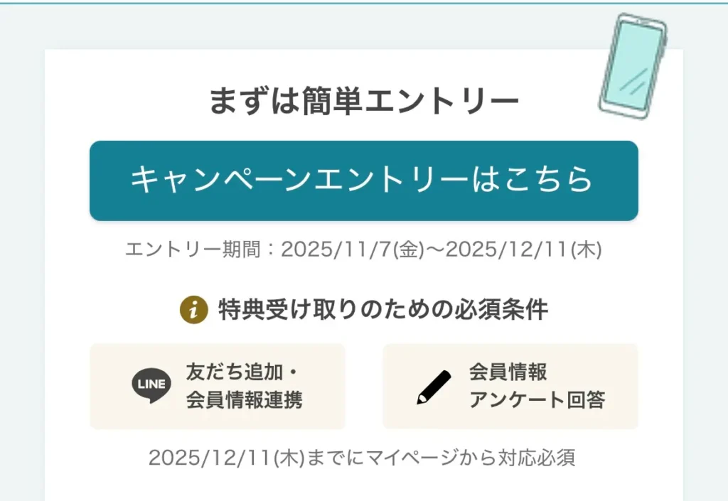 | エントリー期限 | 2025/11/7(金)~2025/12/11(木) | 2025/10/23(木) ~2025/11/21(金) | エントリー不要 (キャンペーン内容がわかる 画面提示) |